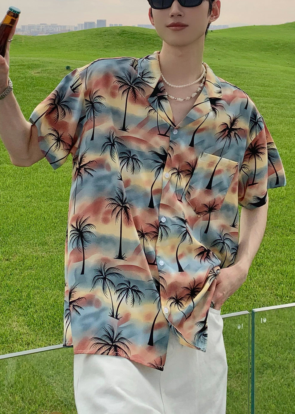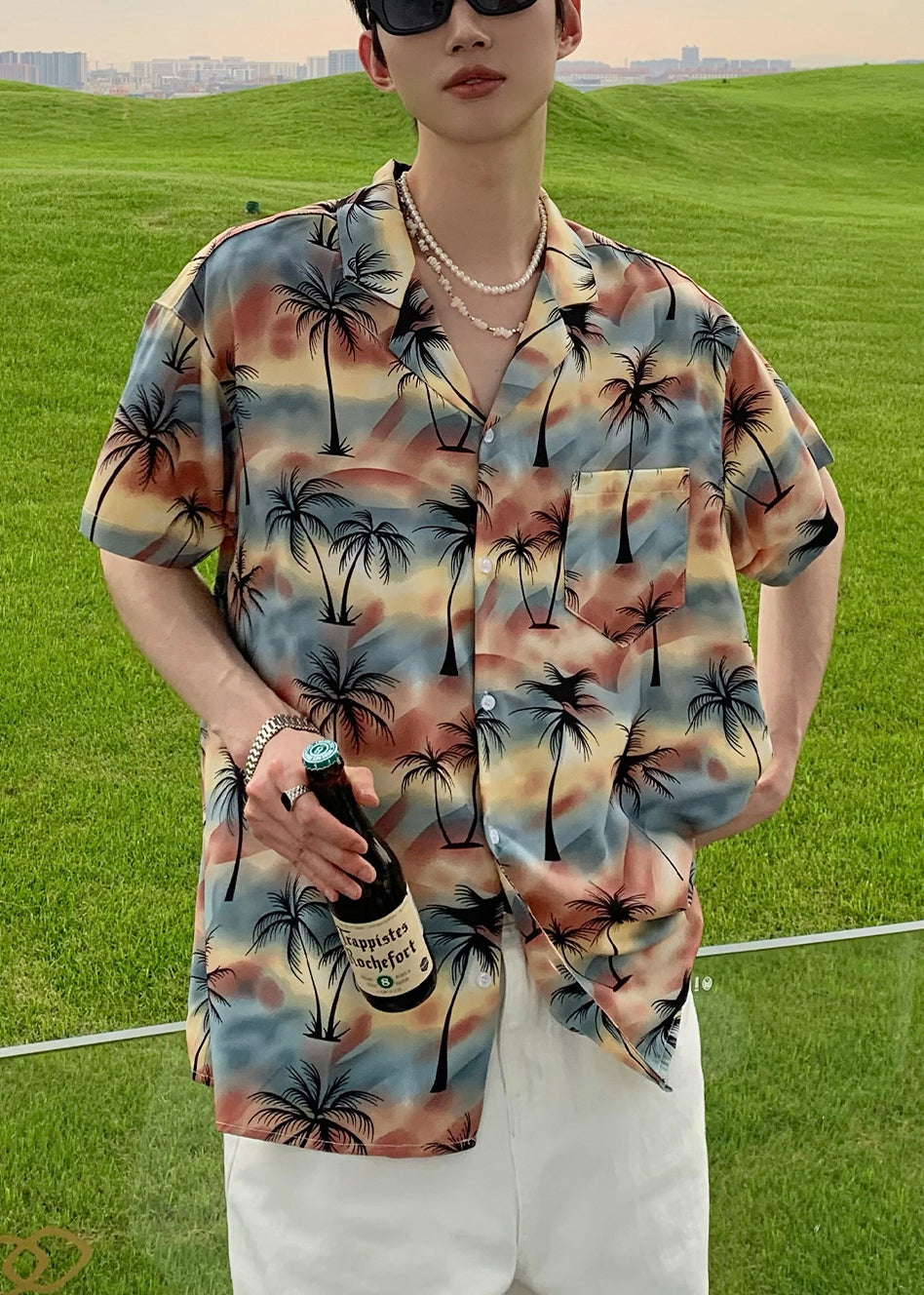 Stylish Blue Peter Pan Collar Button Print Cotton Men Shirts Summer