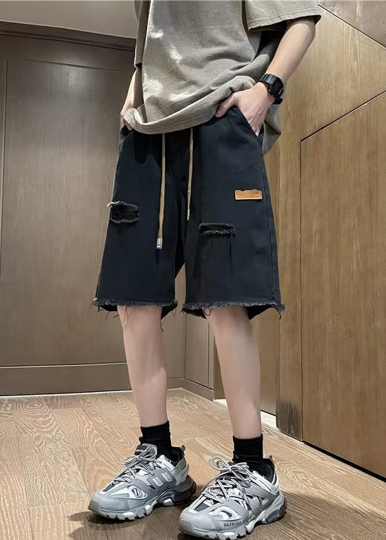 New Black Pockets Drawstring Denim Men Ripped Jeans Summer YL023