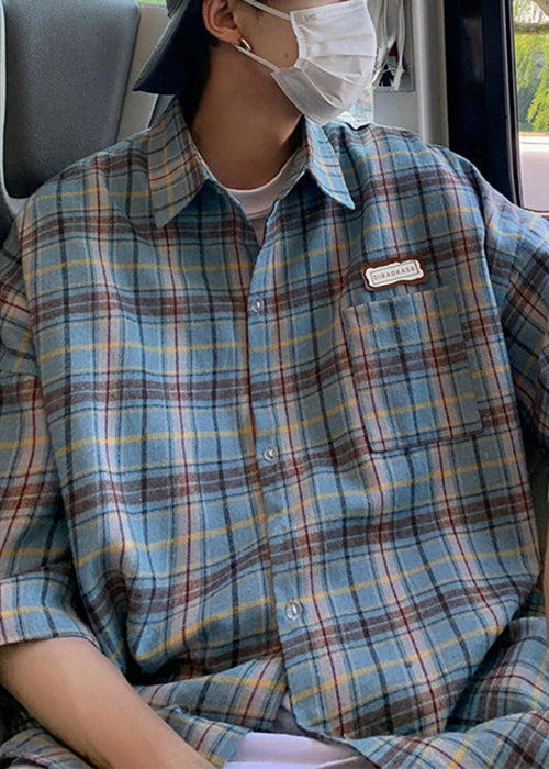 Art Beige Plaid Button Cotton Men Shirt Summer