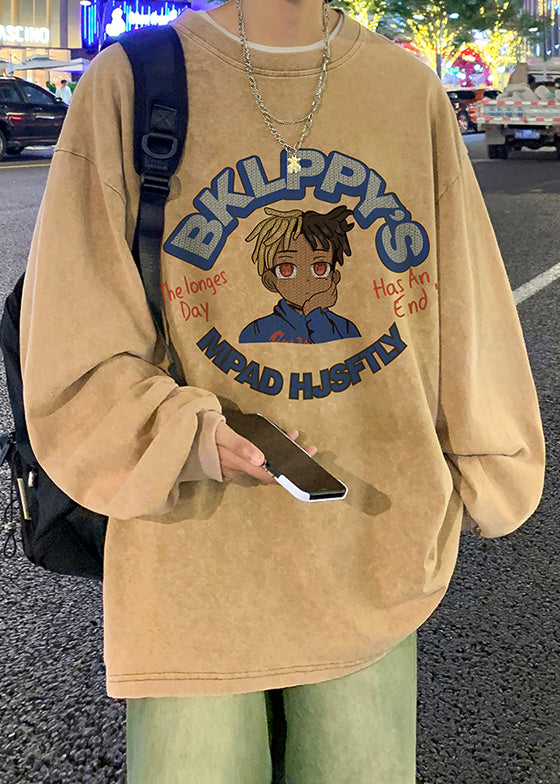 Khaki Print Loose Cotton Mens T Shirts O Neck Spring