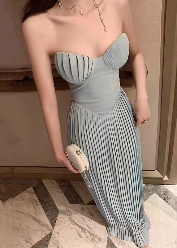 Elegant Light Blue Cold Shoulder Wrinkled Solid Cotton Party Dress Sleeveless