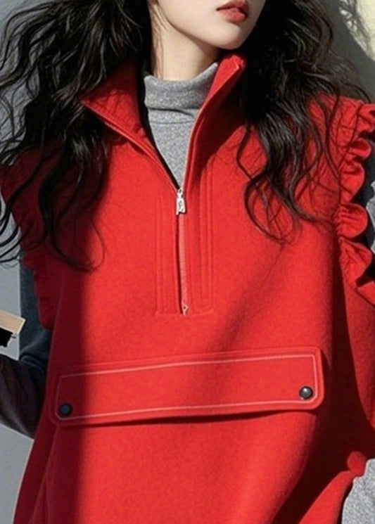 Casual Red Ruffled Zippered Patchwork Cotton Vest Top Sleeveless TN029