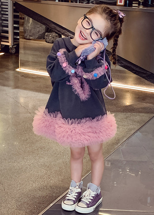 Chic Dark Grey O-Neck Print Tulle Kids Maxi Dresses Lantern Sleeve TG010