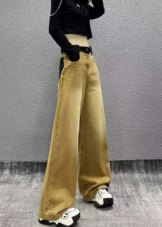 Chic Khaki Pockets Patchwork Denim Wide Leg Pants Fall RI007