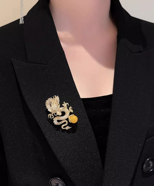 Chinese Style Gold Sterling Silver Alloy Zircon Golden Dragon Playing With Pearl Brooches WP013