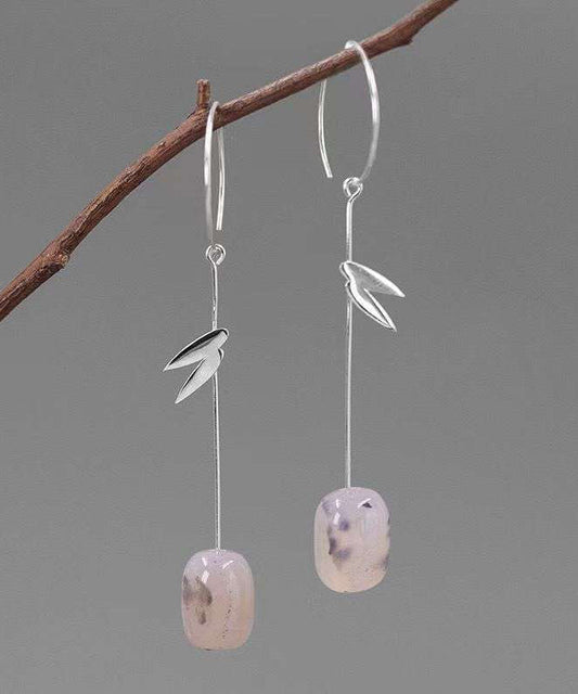 Chinese Style Green Square Sterling Silver Agate Bamboo Leaves Drop Earrings WH020