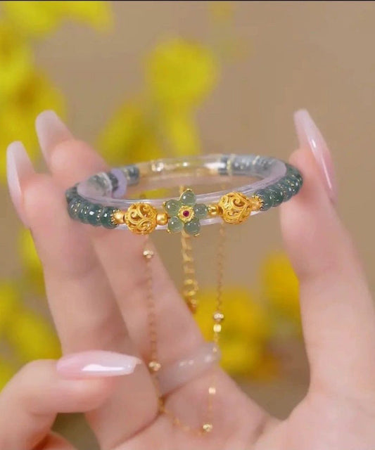 Classy Green Sterling Silver Overgild Jade Floral Tassel Charm Bracelet QD048