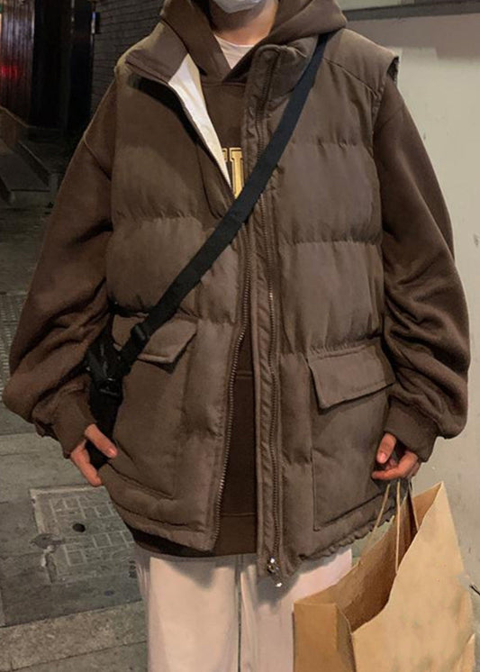 Simple Khaki Stand Collar Zip Up Cotton Filled Men Waistcoat Winter EQ035