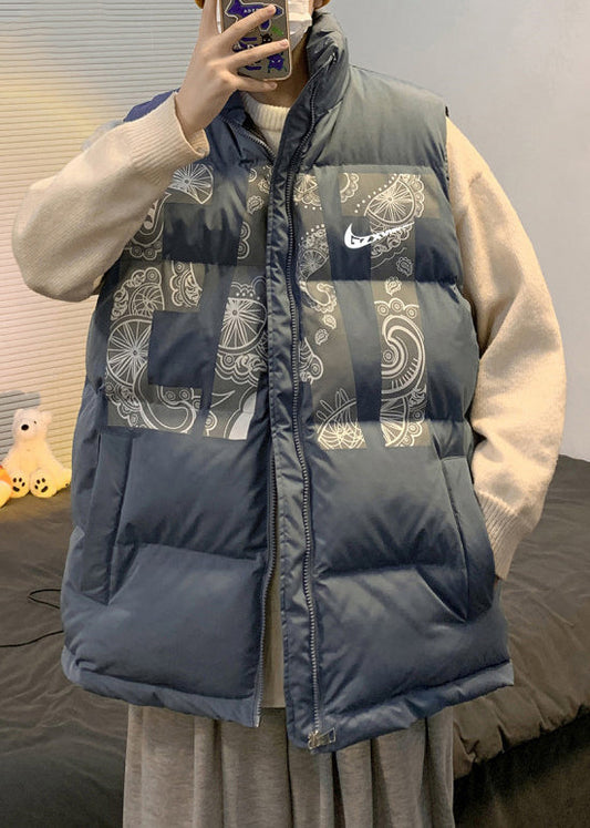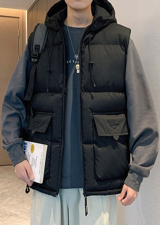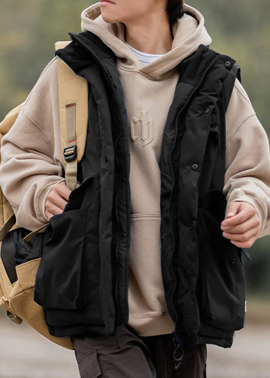 Loose Black Hooded Zippered Print Cotton Filled Men Waistcoat Sleeveless EQ030