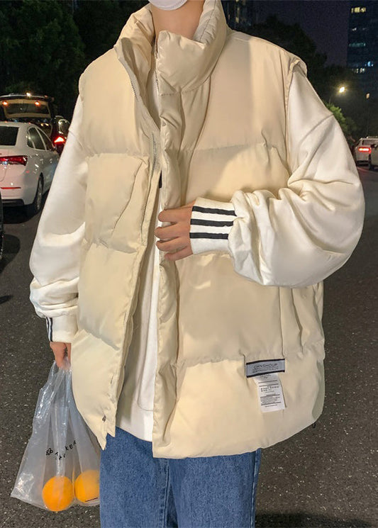 Simple Beige Stand Collar Pockets Cotton Filled Men Waistcoat Winter EQ028