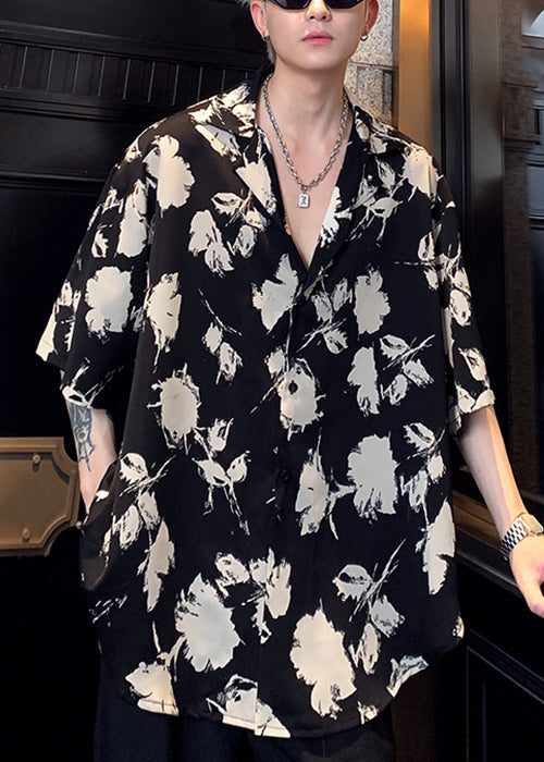 Black Stylish Men Pan Button Cotton Peter Collar Shirts Print