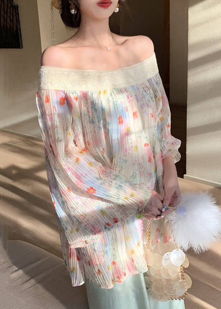 Chiffon Chic Print Beige Fall Wrinkled Embroidered Shirt