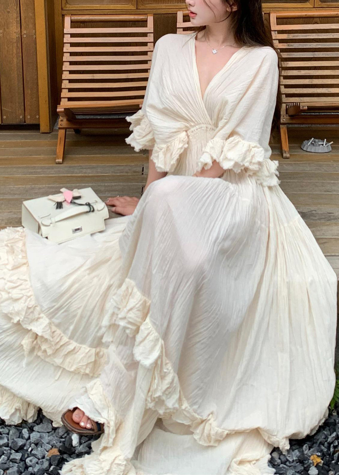 French Beige Ruffled Patchwork Cotton Long Dresses Summer