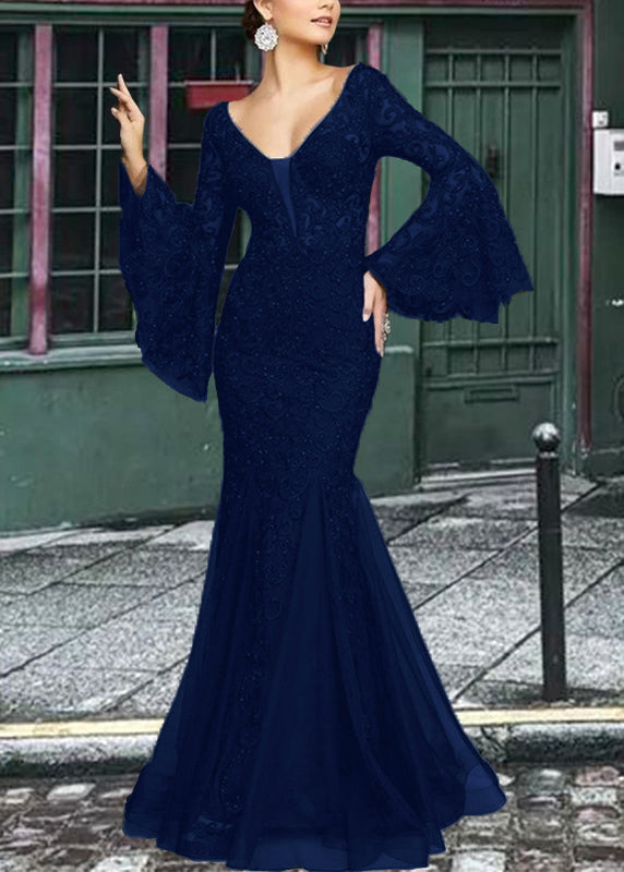 French White Embroidered Solid Lace Fishtail Dresses Flare Sleeve