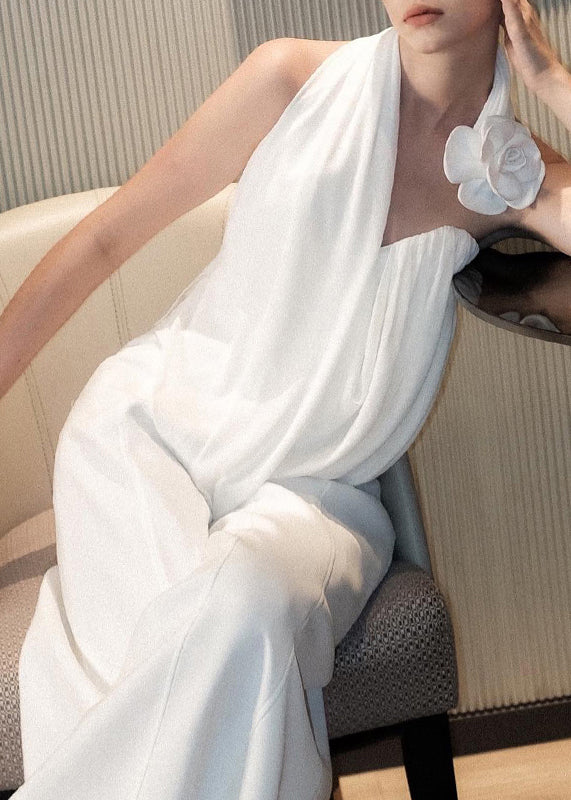 Floral White Asymmetrical Tank And Wide Leg Pants Cotton Two Pieces Set Sleeveless YZ063