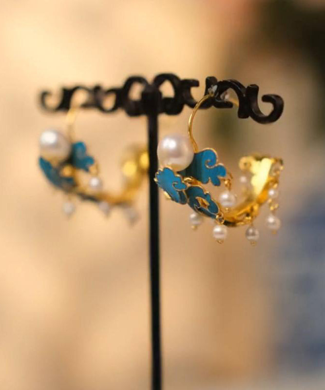 Hoop Cloisonne Sterling Silver Blue Tassel Pearl Enamel Vintage