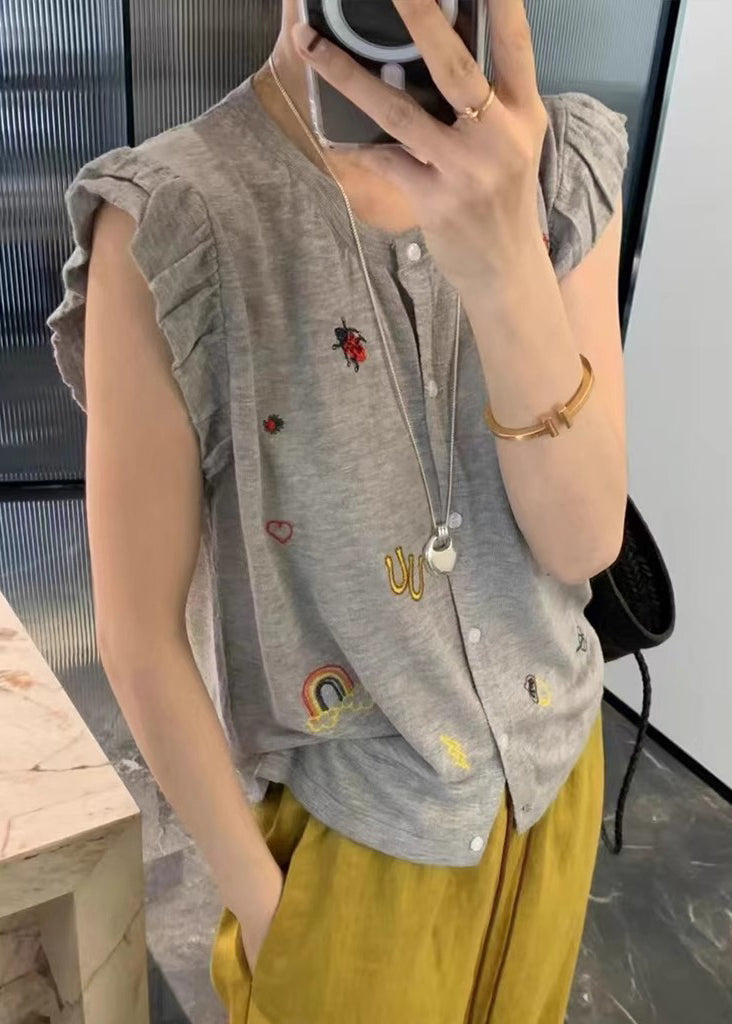 Casual Grey Embroideried Button Down Cotton Vests Sleeveless