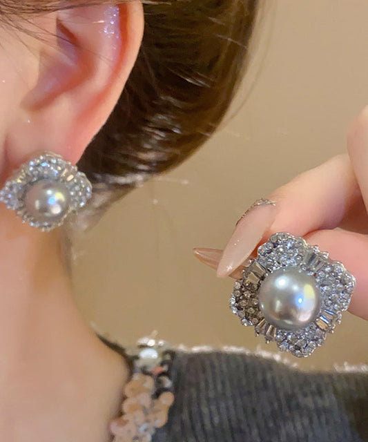 2024 New Grey Alloy Pearl Zircon Stud Earrings PO054