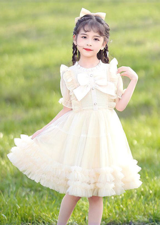 2024 New Pink O-Neck Bow Ruffled Patchwork Tulle Kids Maxi Dress Summer EW022