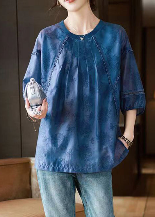 Handmade Blue O-Neck Butterfly Print Top Bracelet Sleeve WW019