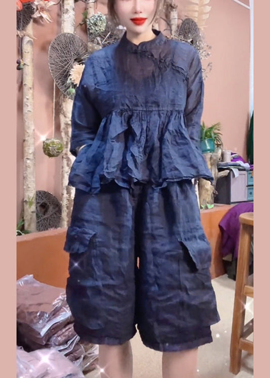 Loose Navy Pockets Solid Linen Two Pieces Set Bracelet Sleeve RE016