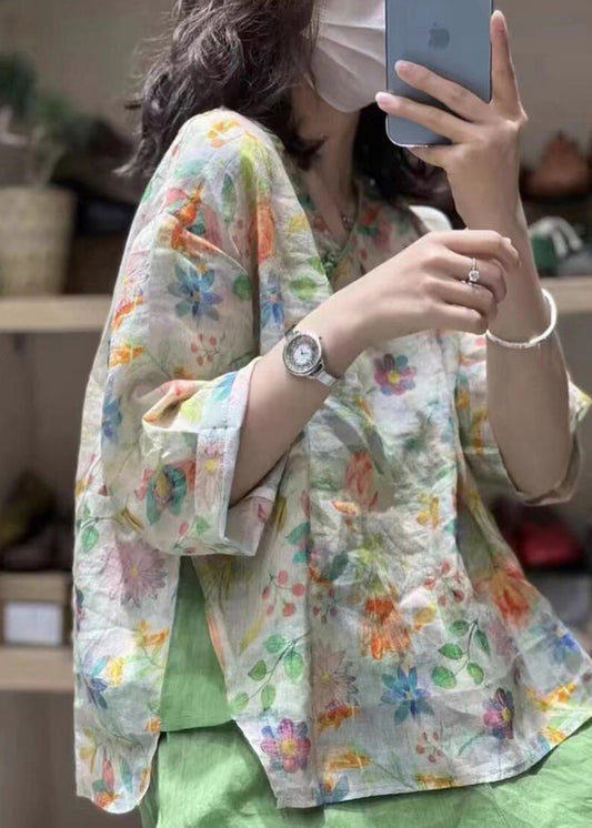 Vintage Green V Neck Print Top Bracelet Sleeve UU032