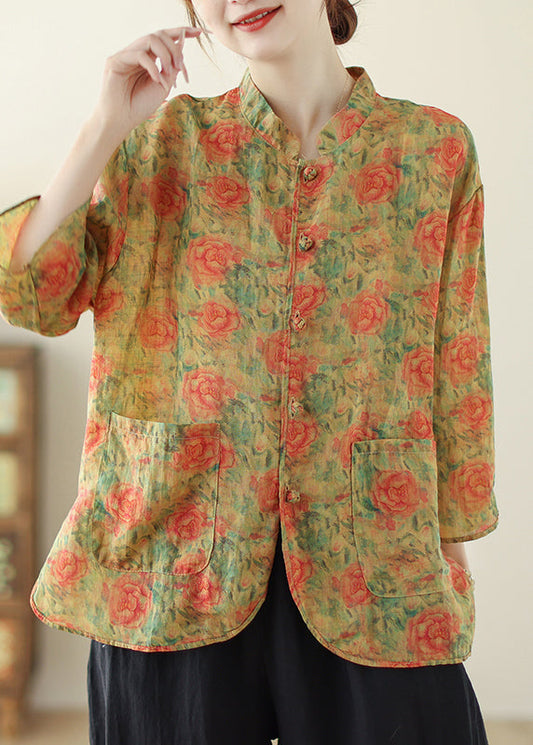 Vintage Blue Button Print Linen Shirts Bracelet Sleeve RE026