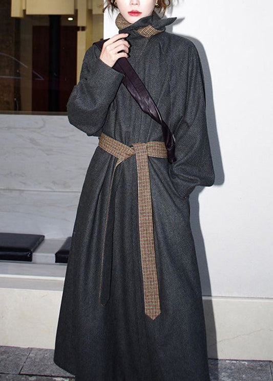 Novelty Blackish Green Turtleneck Patchwork Tie Waist Woolen Maxi Trench Coats Spring TA014