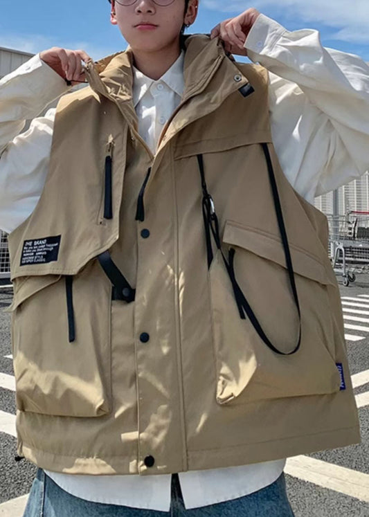 New Khaki Hooded Zippered Letter Cotton Mens Waistcoat Spring RN004