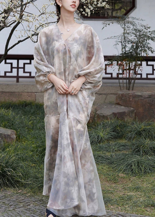 Fashion Beige V Neck Print Tie Waist Chiffon Maxi Dress Short Sleeve UU1055