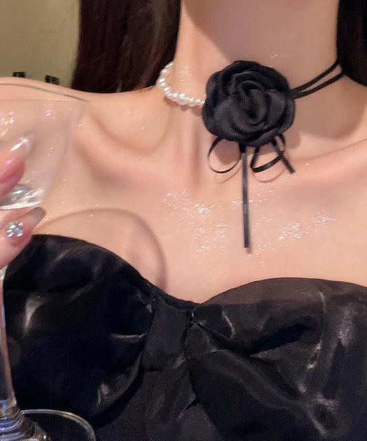 Modern Black Zircon Beading Bow Tie Lace Pearl Love Pendant Necklace YA014