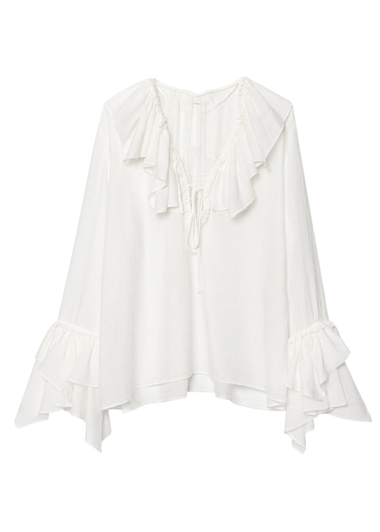 Neck Ruffled Top V Size Chiffon Patchwork White Plus Fall