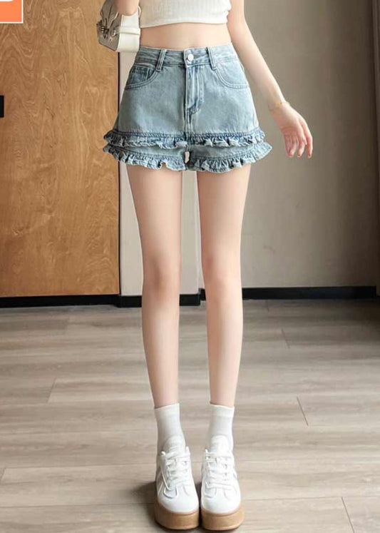 Summer Denim Shorts Blue Waist Ruffled High Pockets