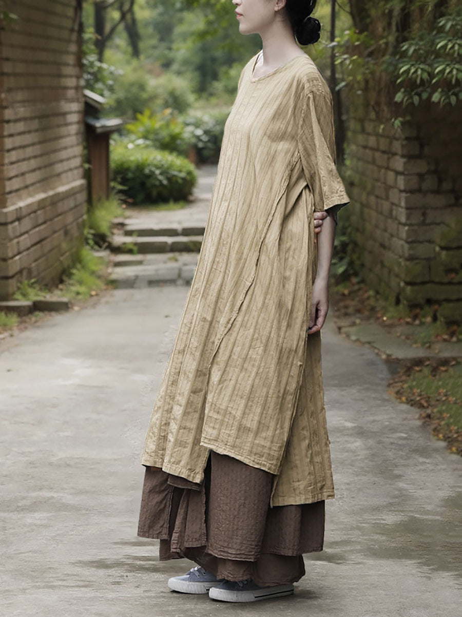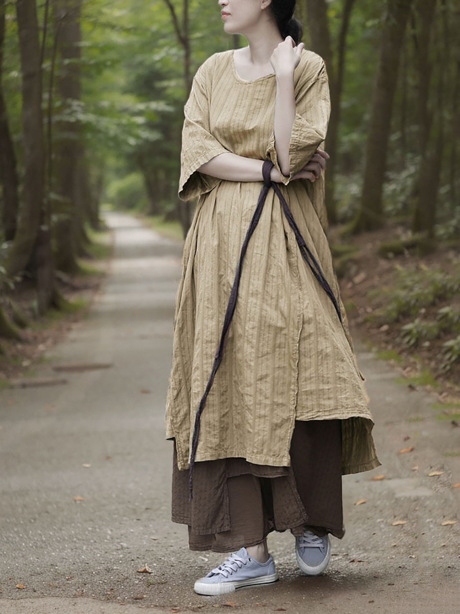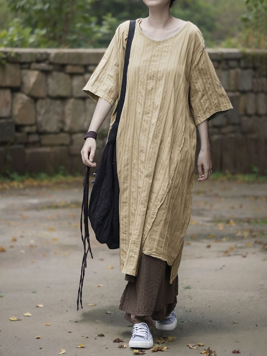 Dress Women Summer O-Neck Cotton Stripe Retro