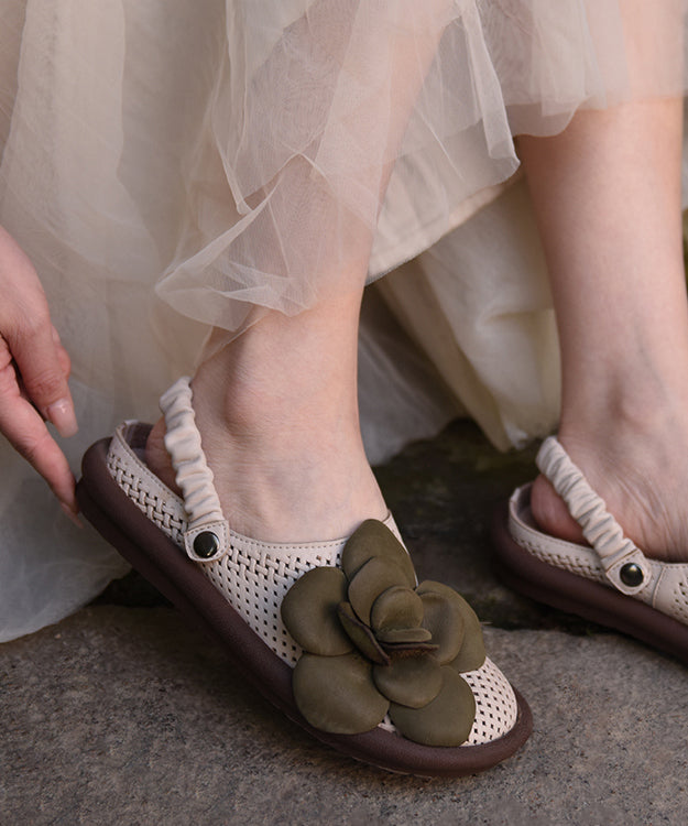 Green Floral Cowhide Leather Comfy Flat Sandals Hollow Out