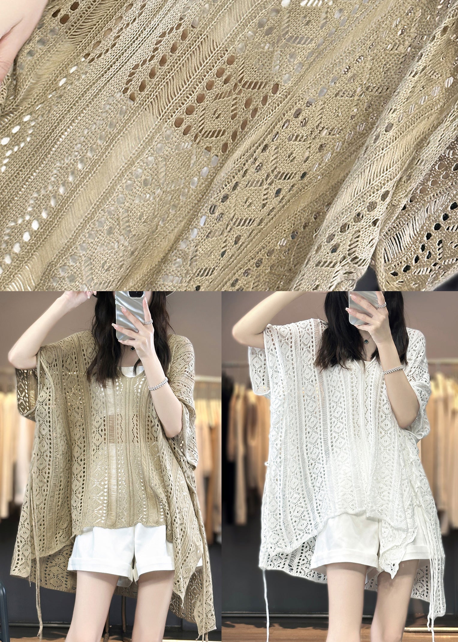 Camel Side Open Knit Summer T Shirts V Neck Hollow Out