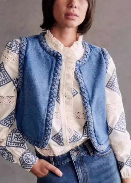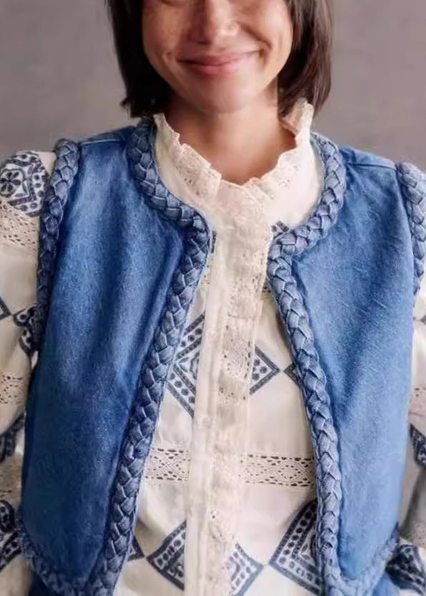 Bohemian Blue O Neck Fine Cotton Filled Denim Vest Sleeveless