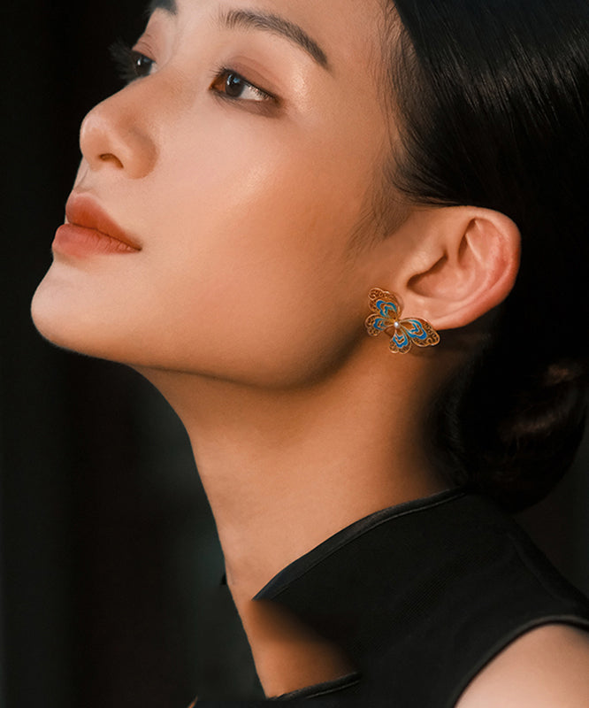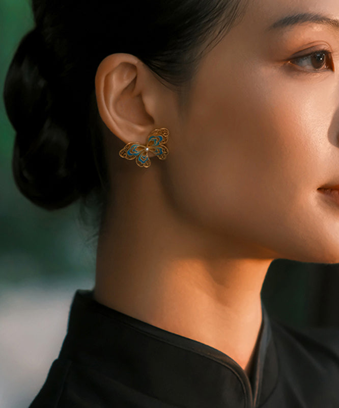 Vintage Gold Sterling Silver Overgild Butterfly Pearl Hollow Out Stud Earrings
