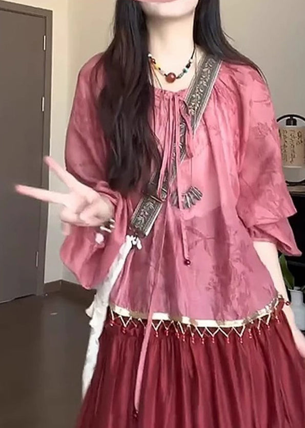 Pink Loose Lace Up Shirt Fall Tasseled Cotton