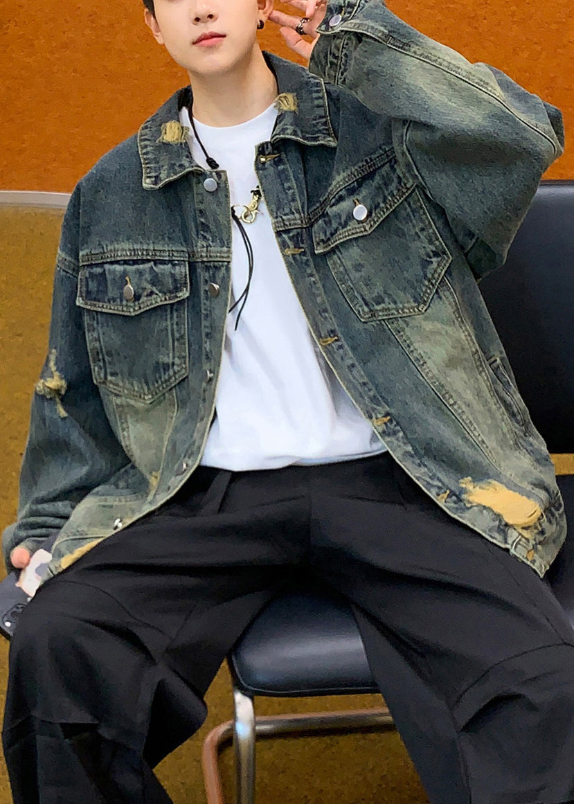 Blue TC036 Hole Denim Retro Mens Denim Pockets Coats Spring Button
