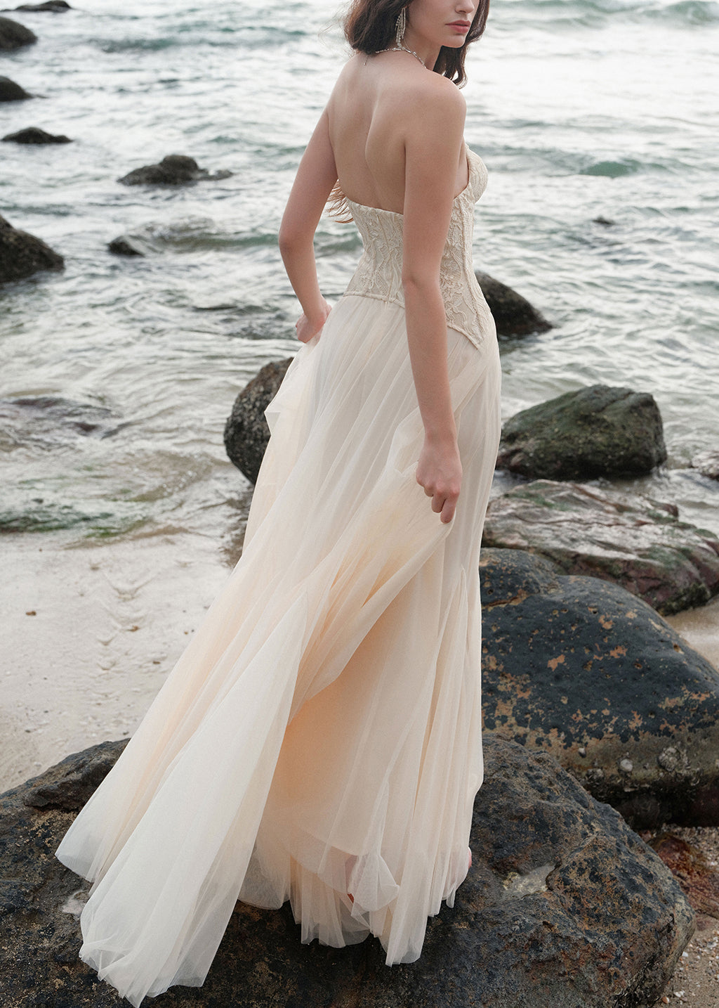 Chic Beige Cold Shoulder Lace Patchwork Tulle Party Dress Sleeveless