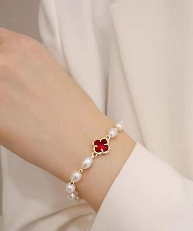 Stylish Green Sterling Silver Overgild Pearl Clover Charm Bracelet