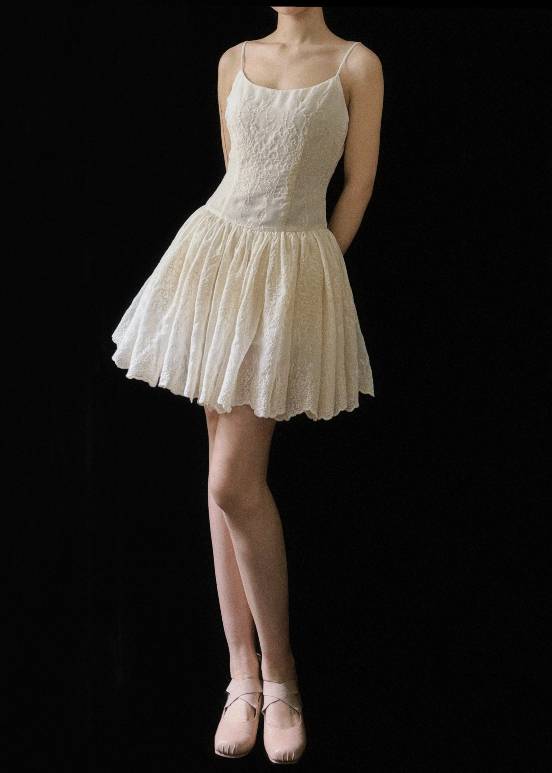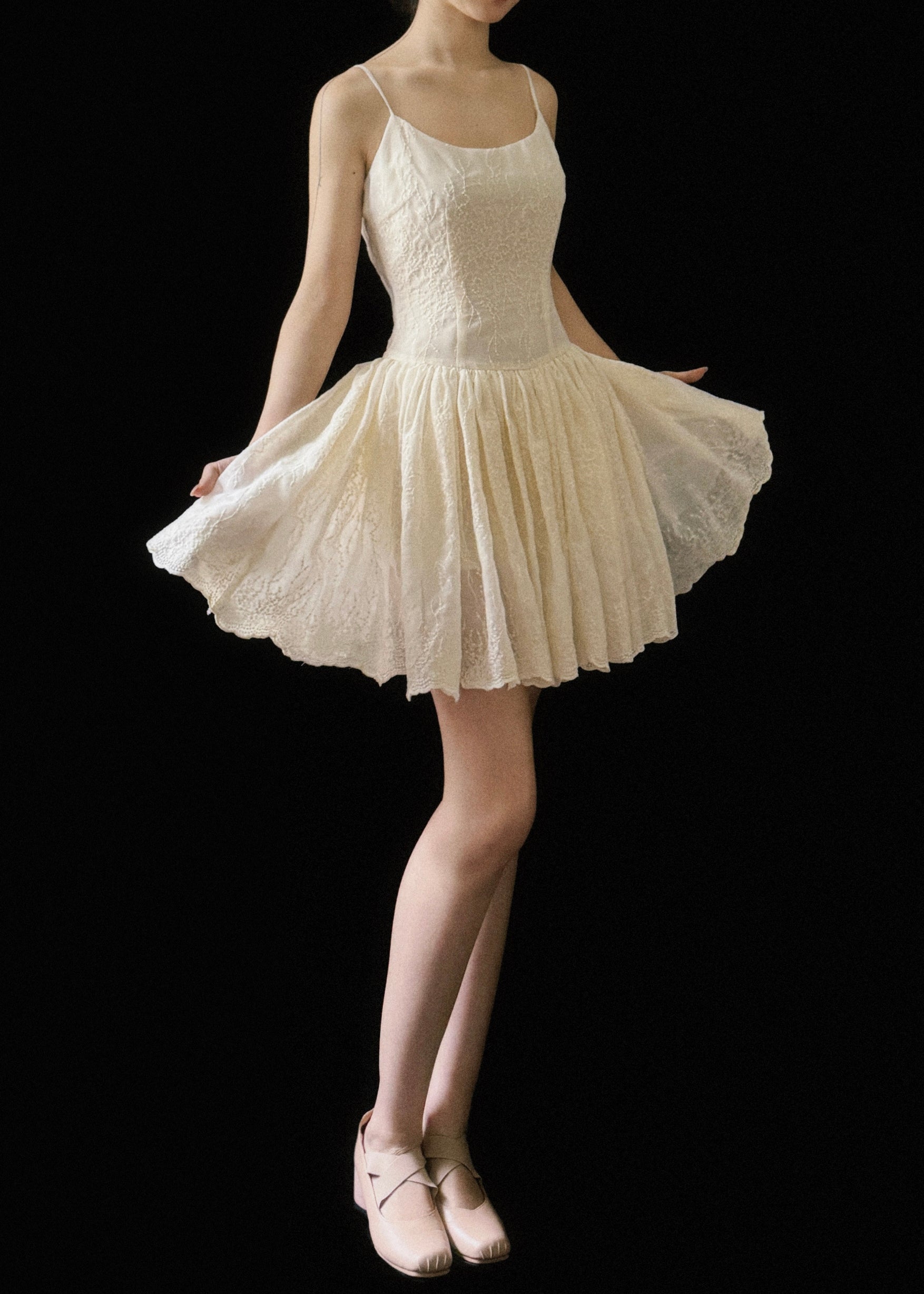 Sleeveless Wrinkled Cotton Dresses Mini Beige Embroidered New