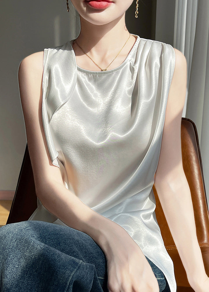 Stylish White O Neck Side Open Silk Tank Sleeveless