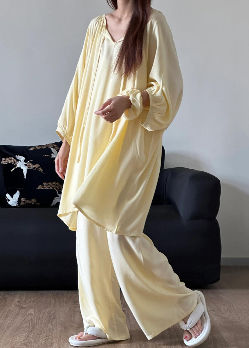 Simple Blue O Neck Lace Up Solid Cotton Pajamas Two Piece Set Fall