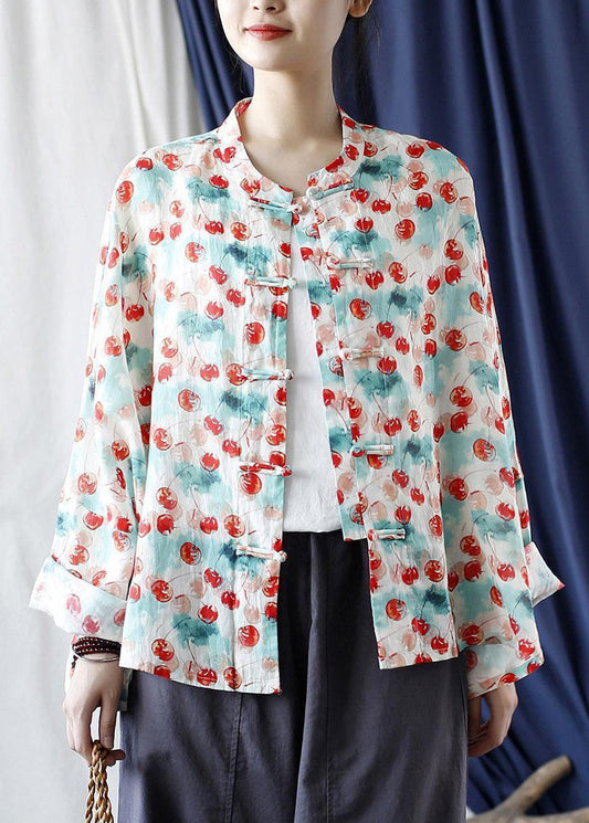Chemise en lin vert chic à col montant et imprimé été VV052