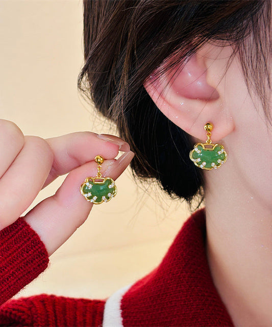 Boucles d'oreilles à tige en argent sterling vert de style chinois avec fermoir de sécurité en jade et zircone surdoré WH045