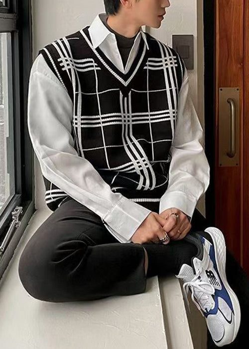 Black Plaid Loose Knit Men Waistcoat V Neck Sleeveless RJ033