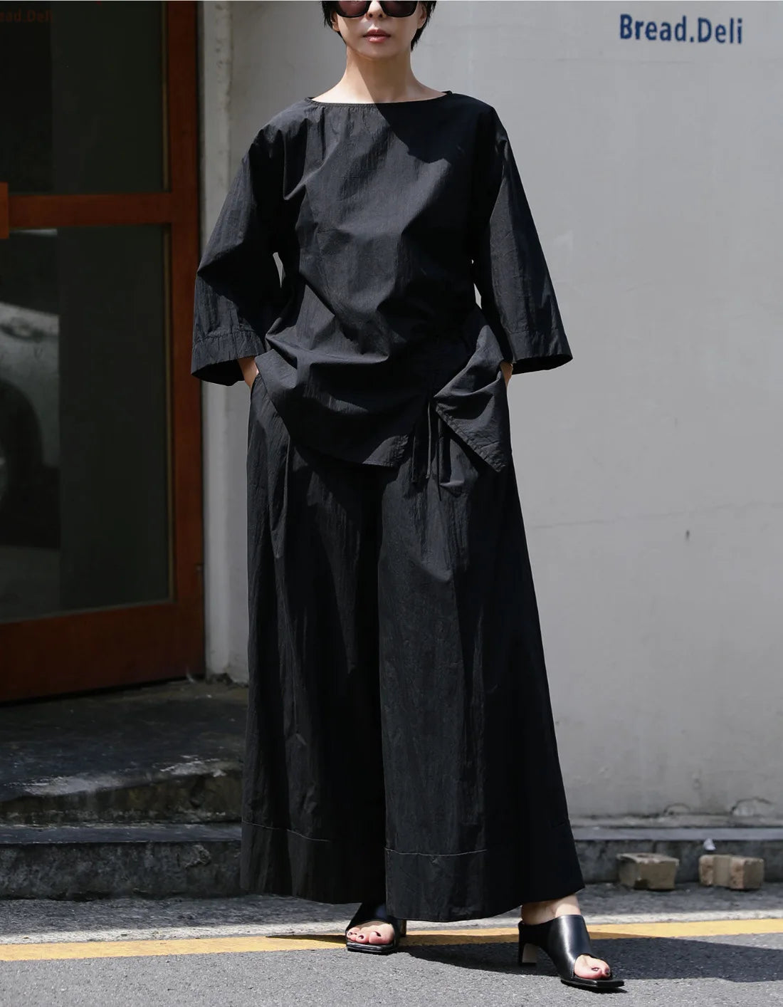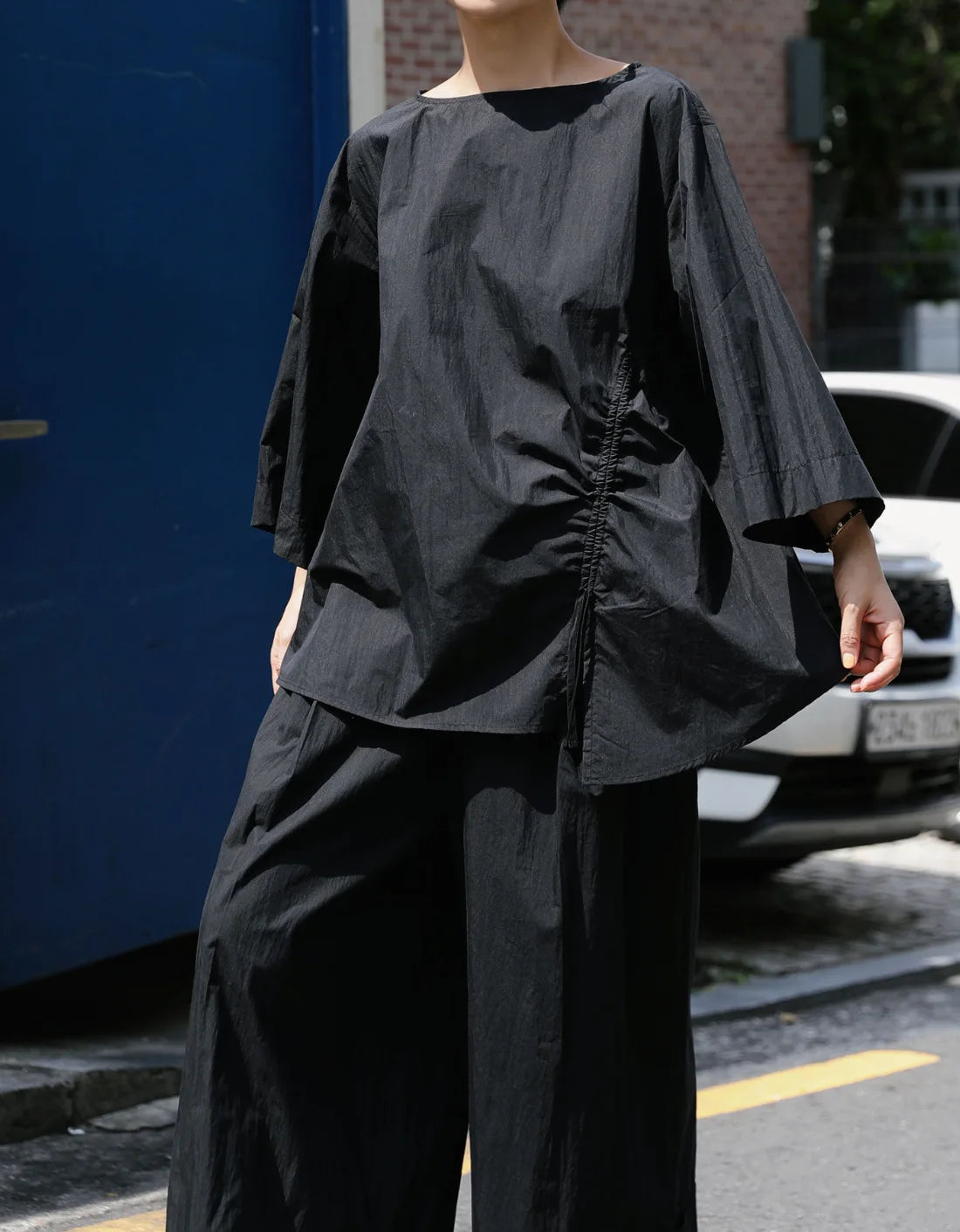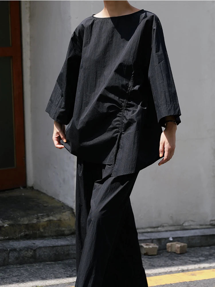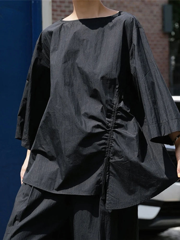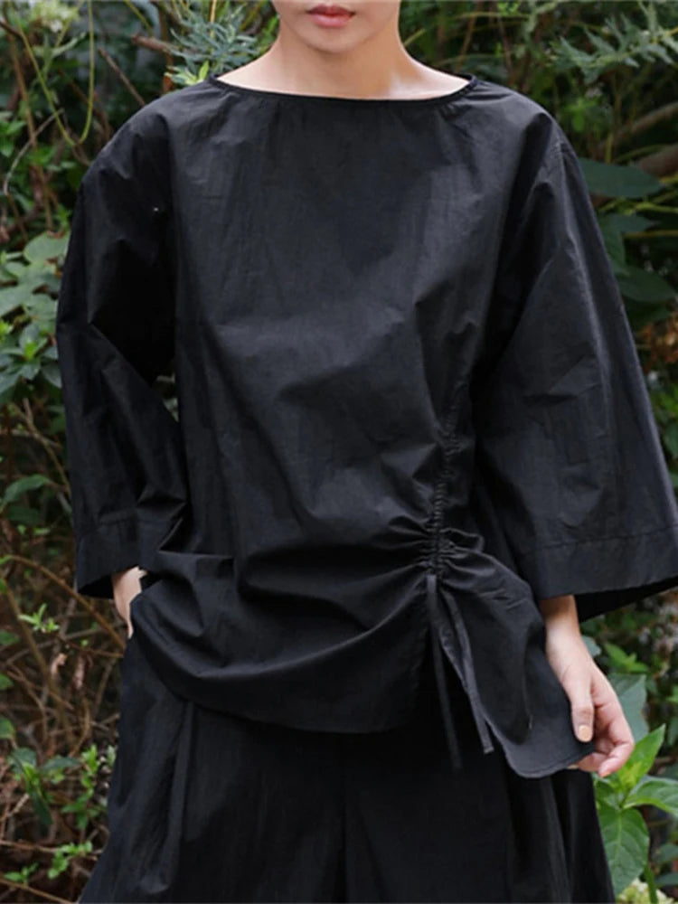 Casual Cotton Top Drawstring Sleeve Khaki Half Asymmetrical