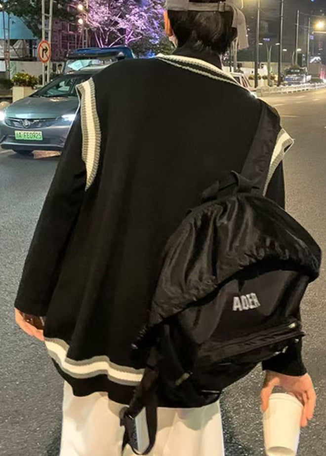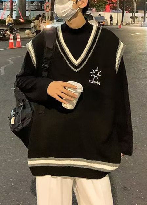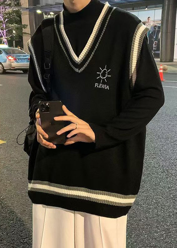 Loose Black V Neck Cozy Patchwork Knit Men Waistcoat Sleeveless RJ027